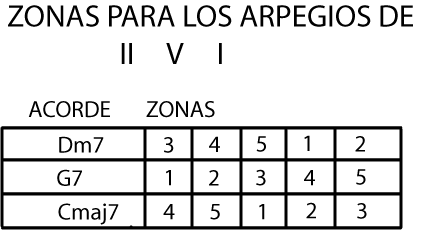 Les dejo a continuación el cuadro donde organizo la superposición de las zonas de los arpegios; los diagramas de dichos arpegios los encontrarán en las clases anteriores, por lo que será necesario tener bien trabajado lo anterior.
